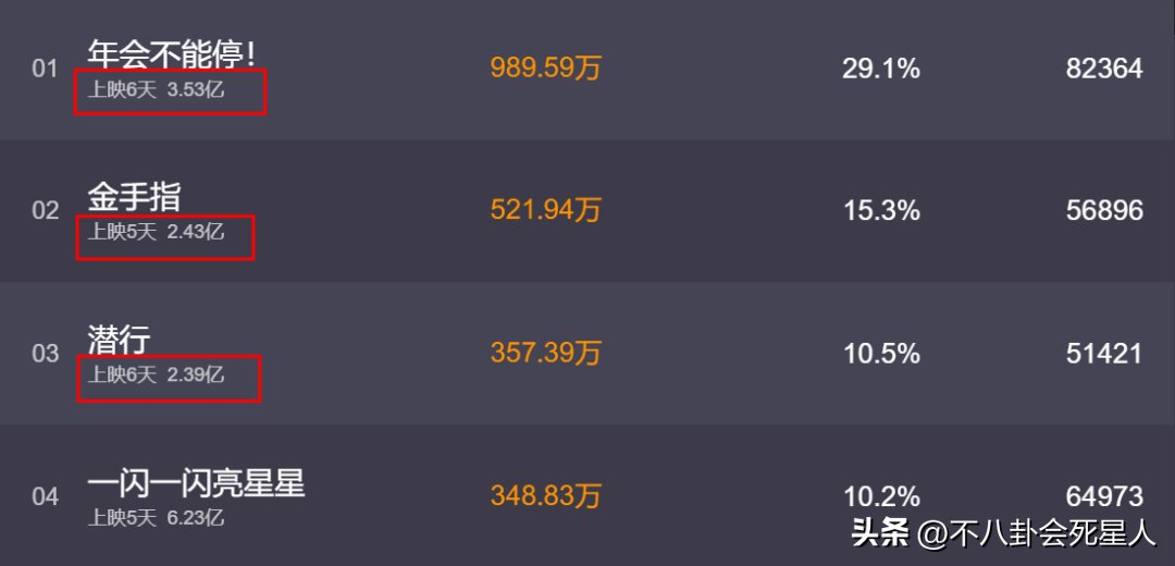 两部电影上映时辰王人是在五六天傍边,《金手指》的票房是2.43亿,《潜行》的票房是2.39亿元,先不说比不上《一闪一闪亮晶晶》的6亿票房,也比不上“黑马”《年会不行停》。