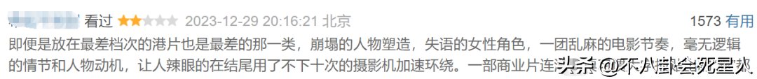 网友对这部电影的评价是,就算放在最差头绪的港片里也算是差的,剧情很乱,女性脚色毫无魔力,说白了港片还在搞几十年前那套,但不雅众早就不吃了。
