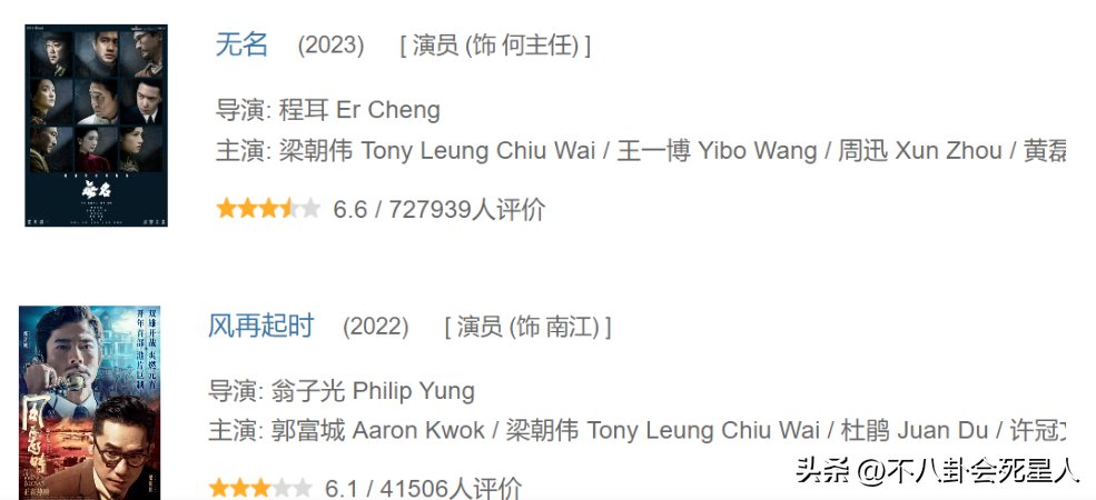 至于也曾港圈最显示的“影帝”梁朝伟,在近几年一部又一部的烂片中早依然耗尽了不雅众的滤镜,从他上一部作品《无名》和《风再起时》反响平平就能看出。